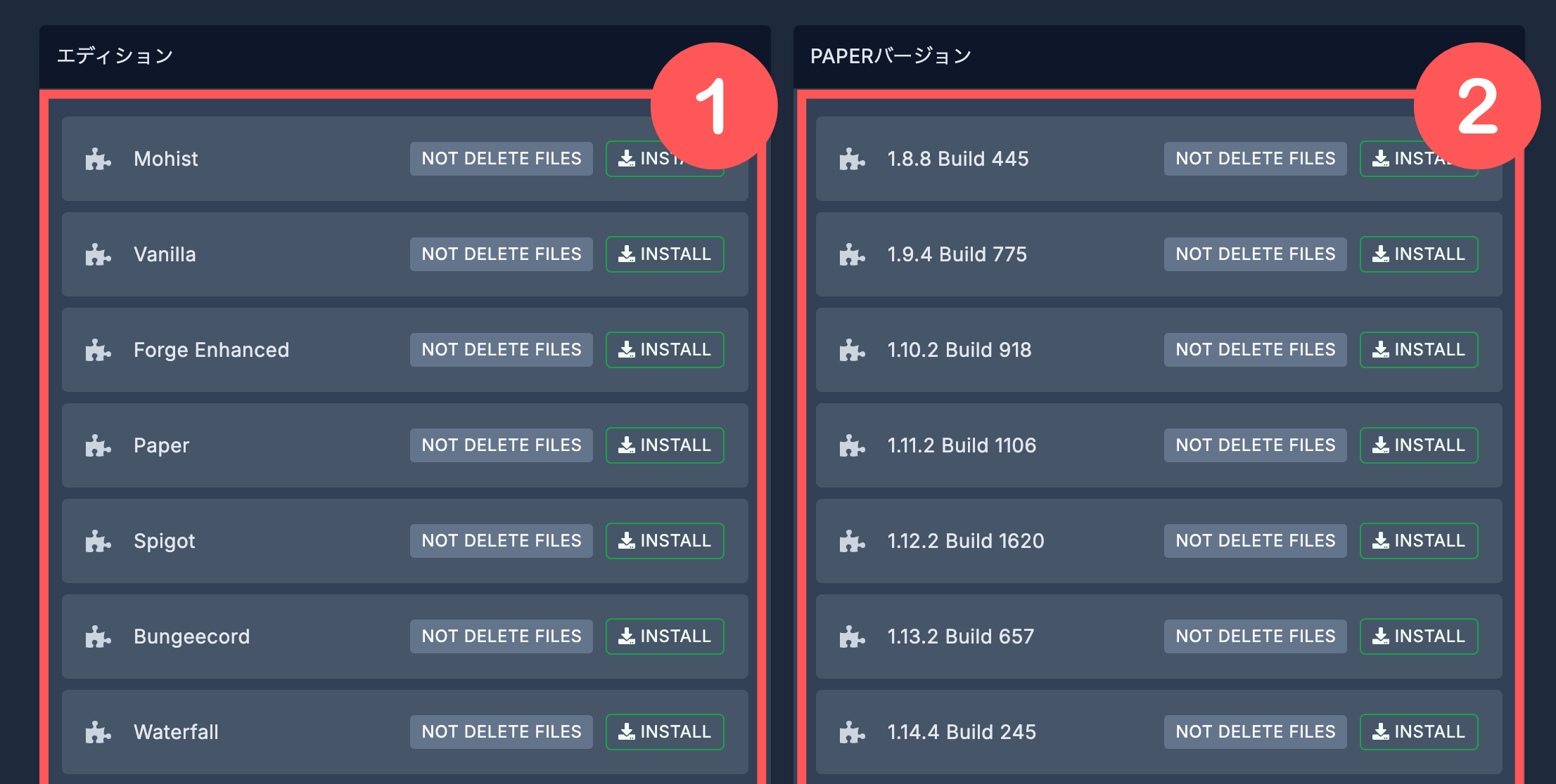 エディションをインストールしたら、遊びたいバージョンの「インストール」をクリックします。プレイヤーの管理(OP権限/ホワイトリスト/キック&バン/インベントリ …etc)