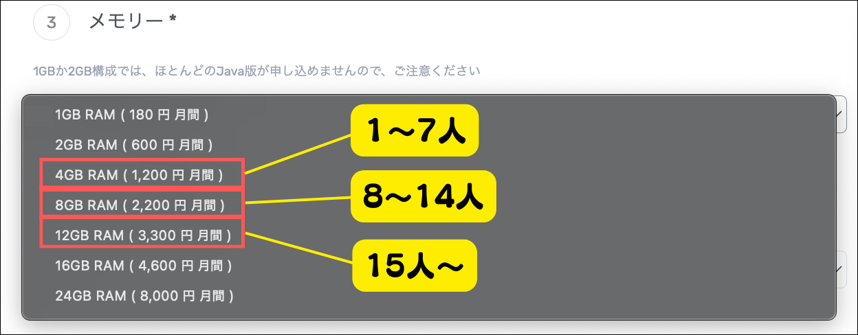 | プラン(プレイ人数) | 4GB (1~7人) | 8GB (8~14人) | 16GB (15人以上) |
