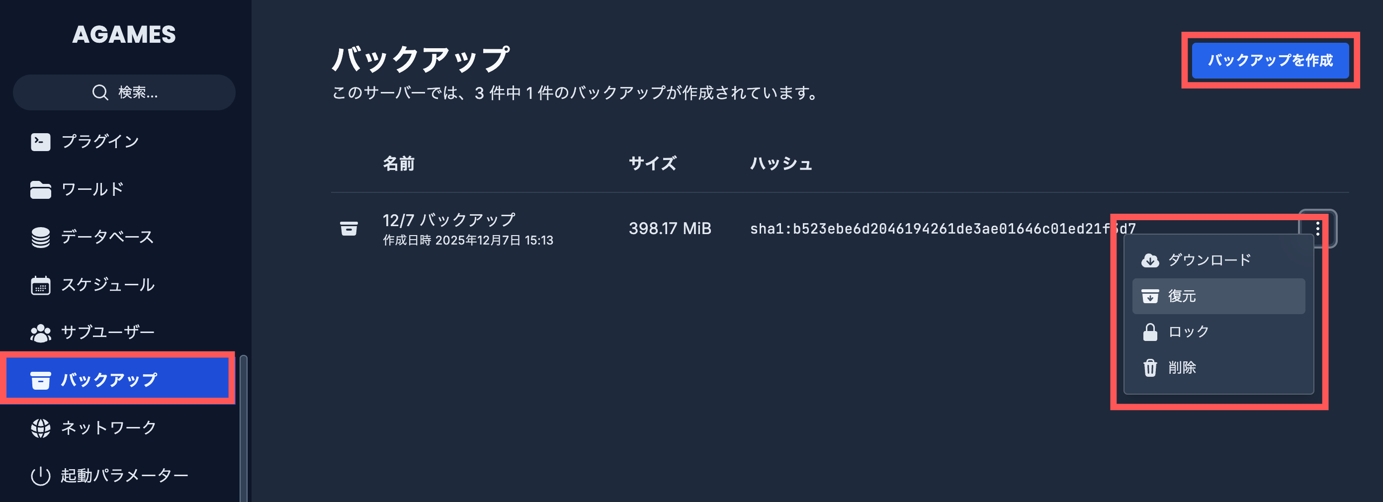 | 管理パネル機能 | ワールドアップロード、OP権限 バージョン変更、バックアップ | ||