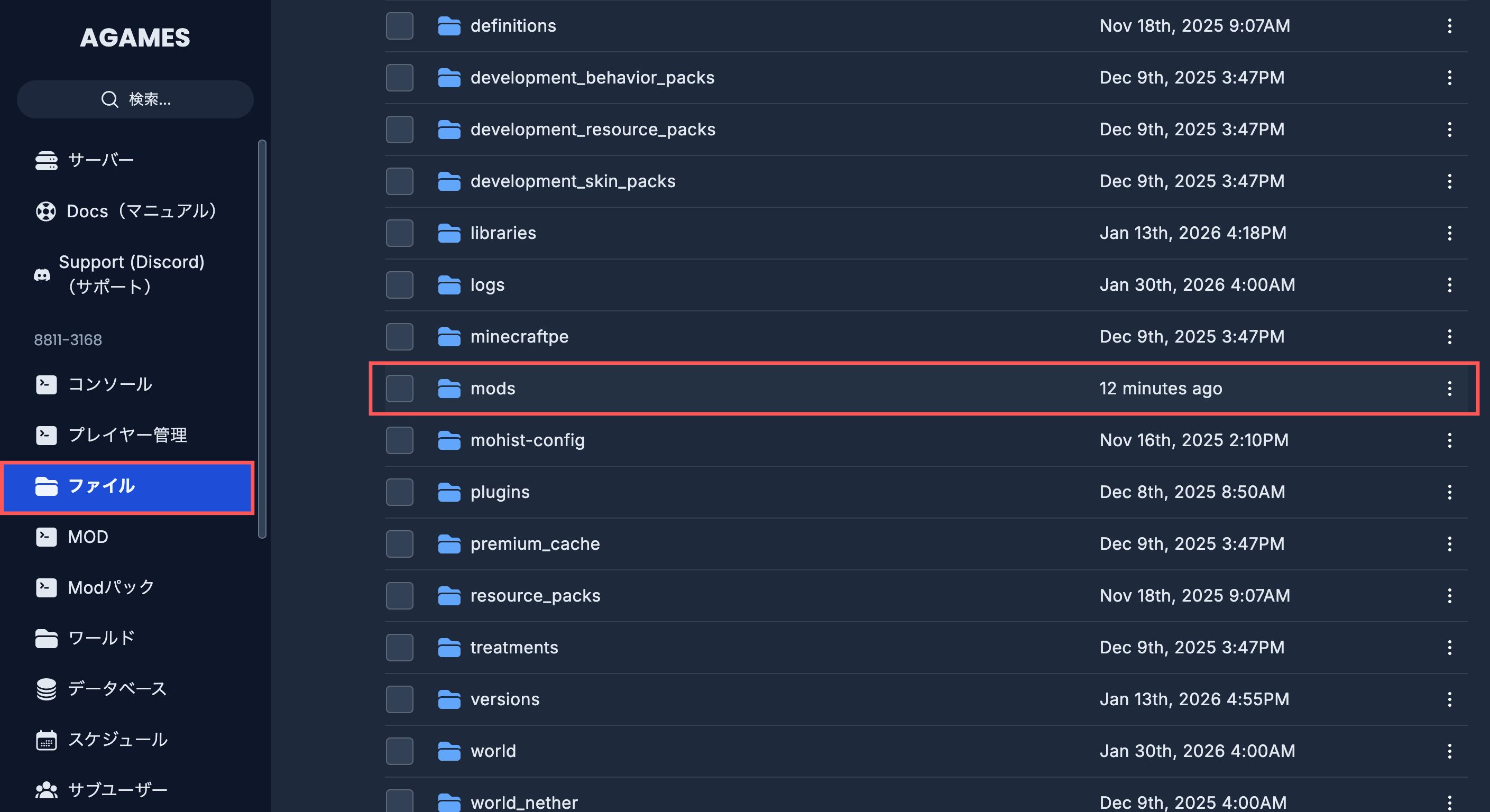 ② AGAMESの管理パネルで「ファイル」▶︎「mods」をクリック