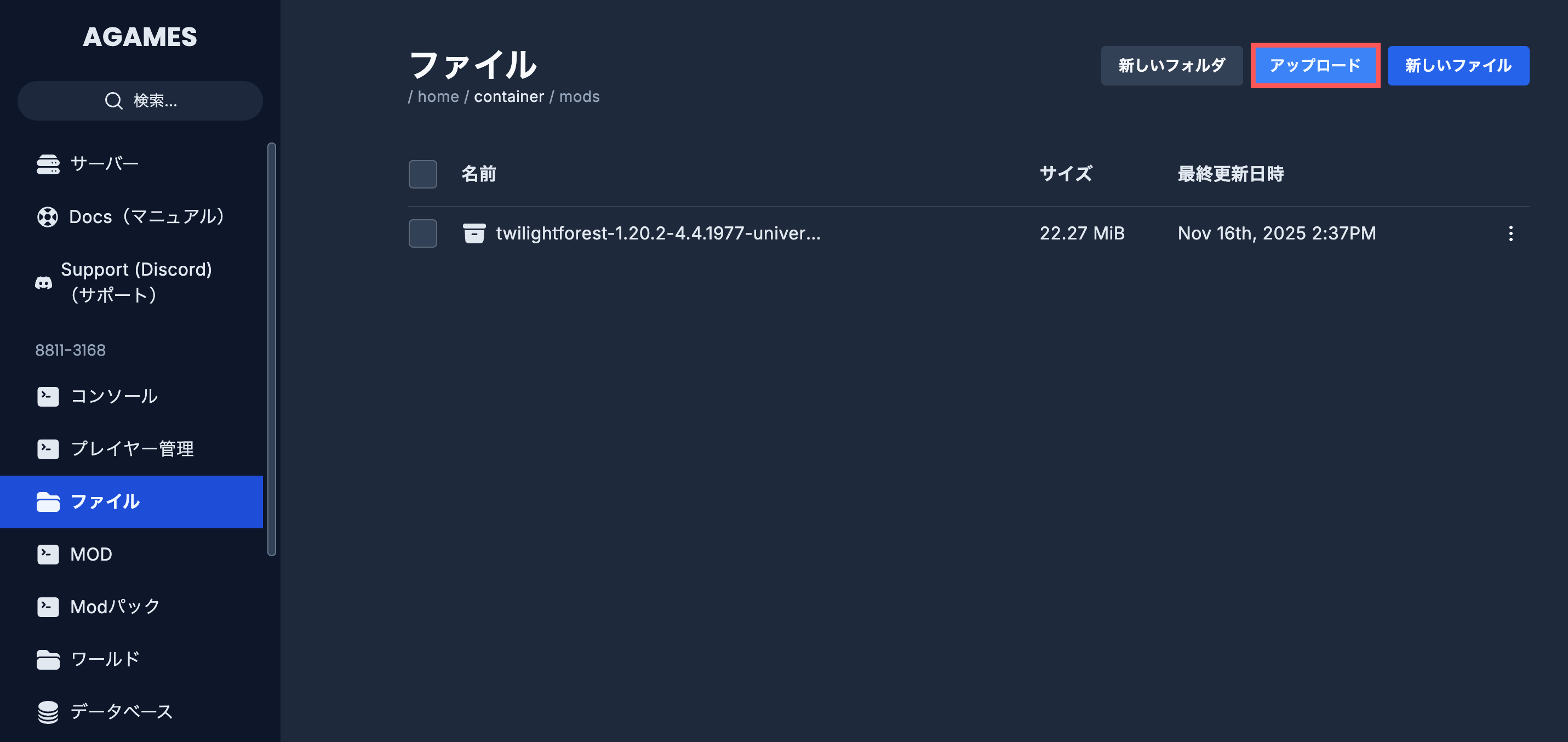 「アップロード」から先ほどダウンロードしたModファイルを選択して追加します。画面にModが追加されれば、サーバー側の準備は完了です!