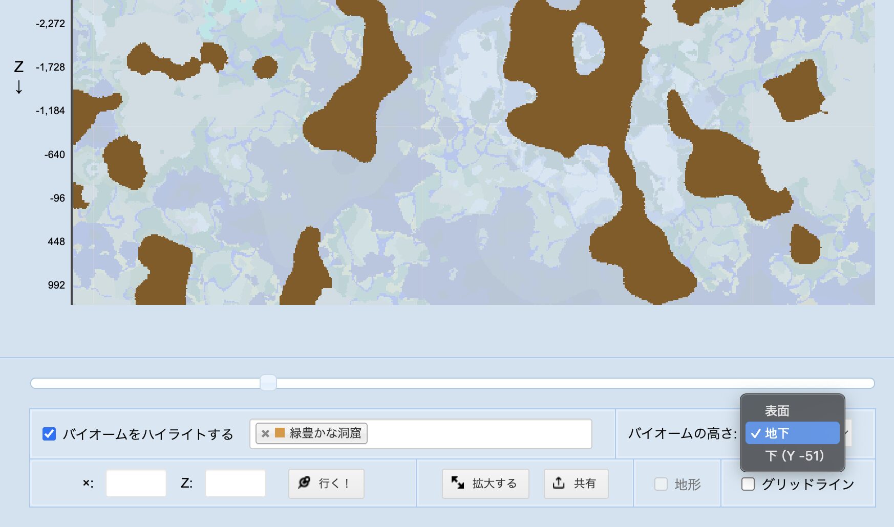 地下にあるバイオーム(繁茂した洞窟/鍾乳洞など)を調べたい場合は「バイオームの高さ」を「地下」にしましょう。