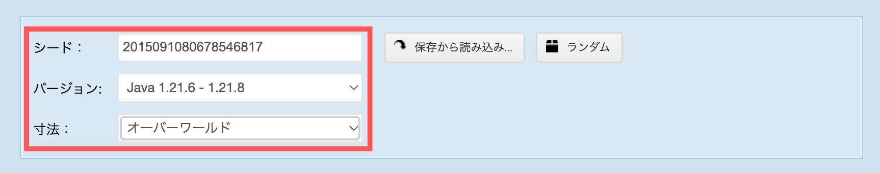 「シード」にシード値、「バージョン」にバージョン、「寸法」にワールドタイプを選択します。