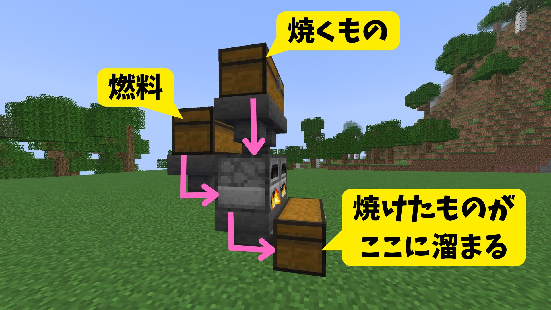 【Step.2】チェストに向かってホッパー、その上にかまどを設置
