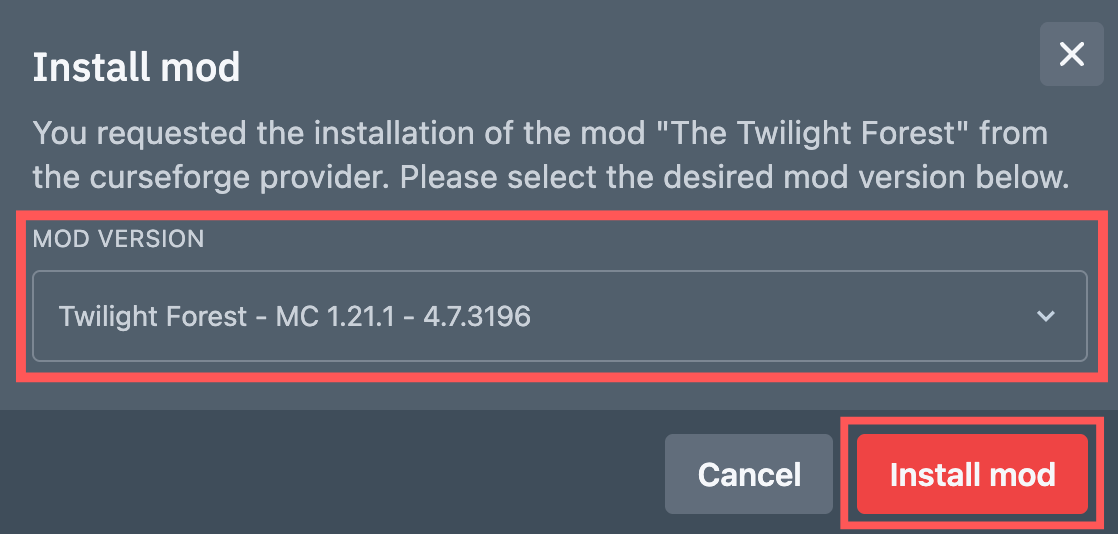 「MOD VERSION」をサーバーと揃えて「Install mod」をクリックします。