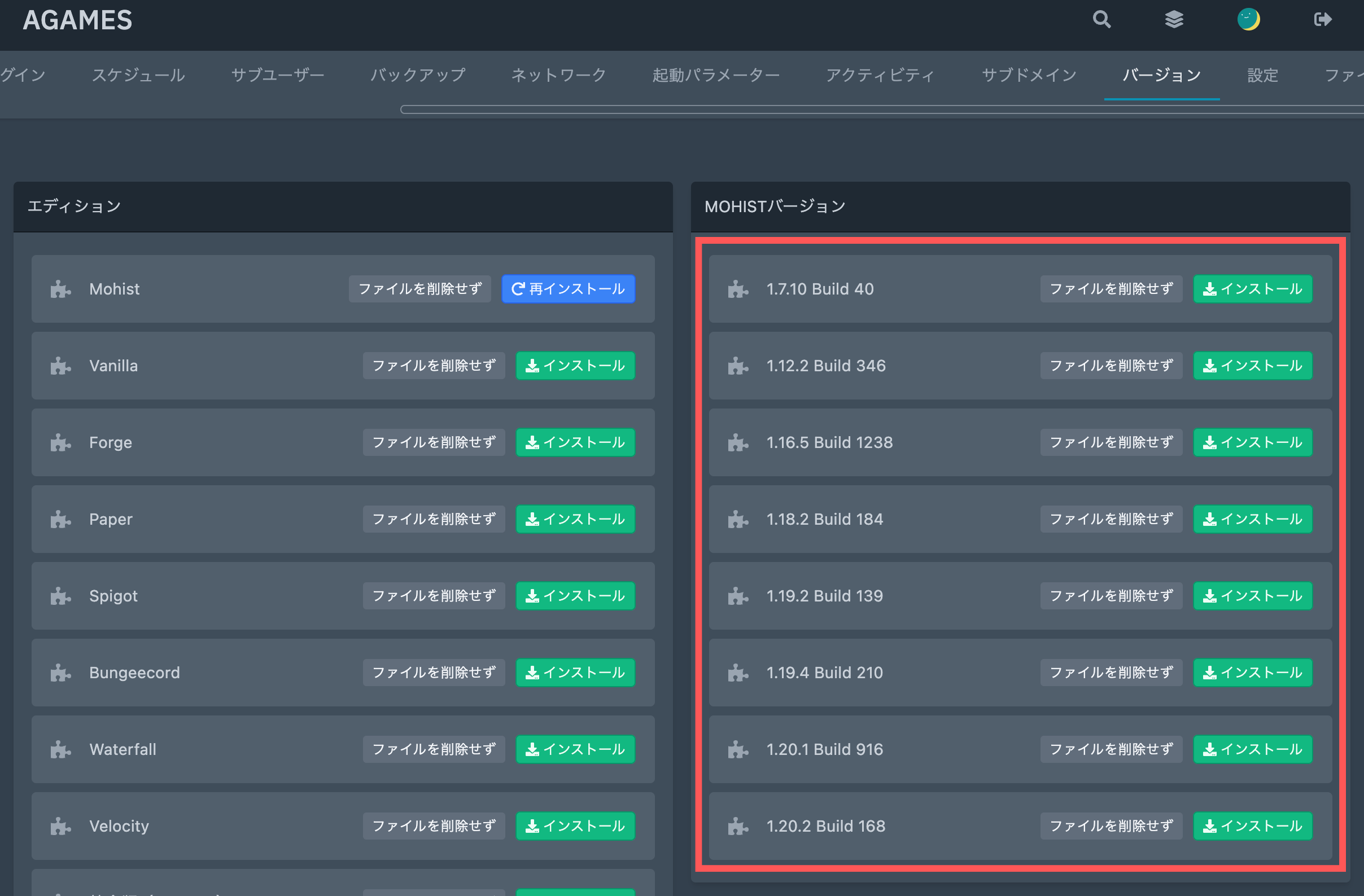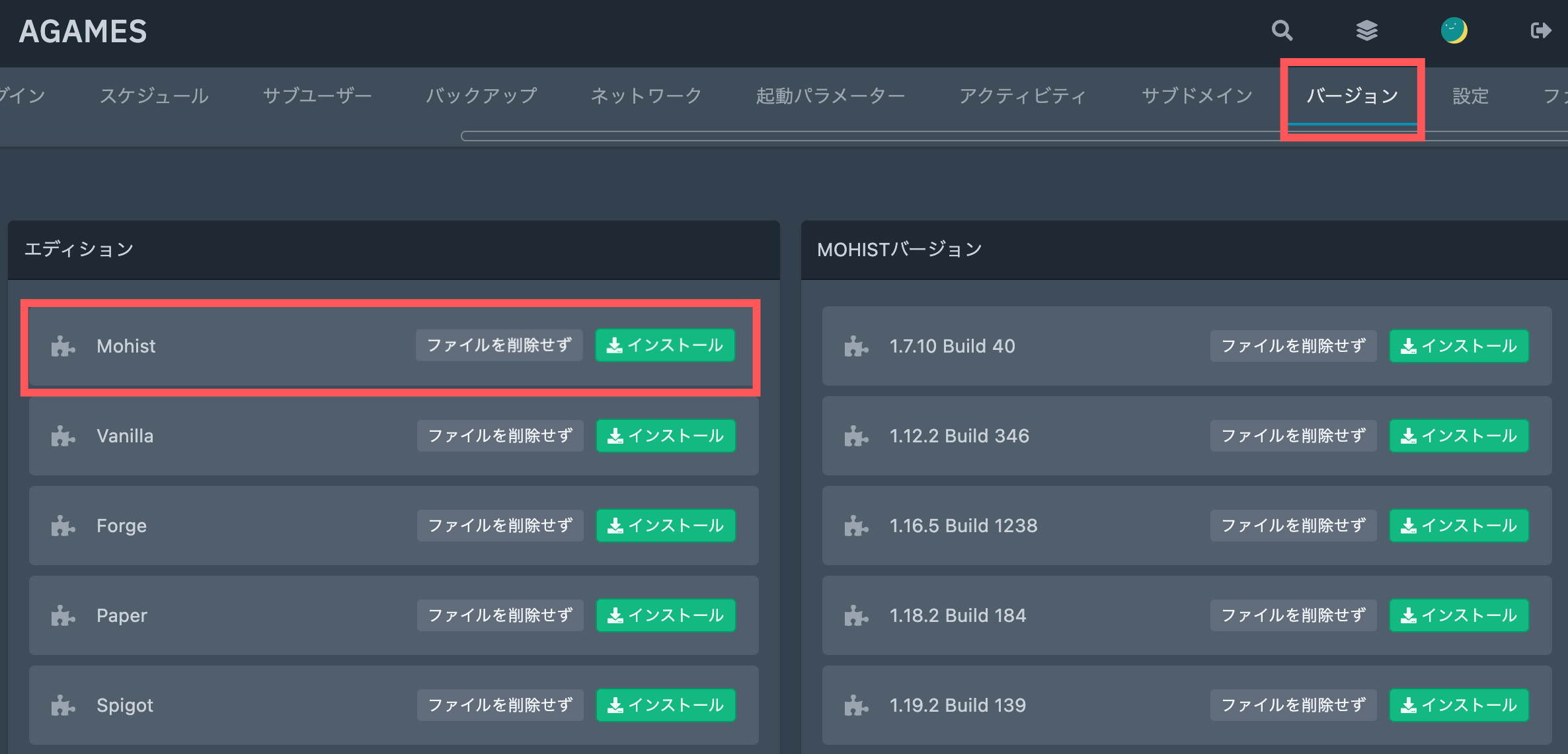 「バージョン」のタブから「Mohist」の「インストール」をクリックします。