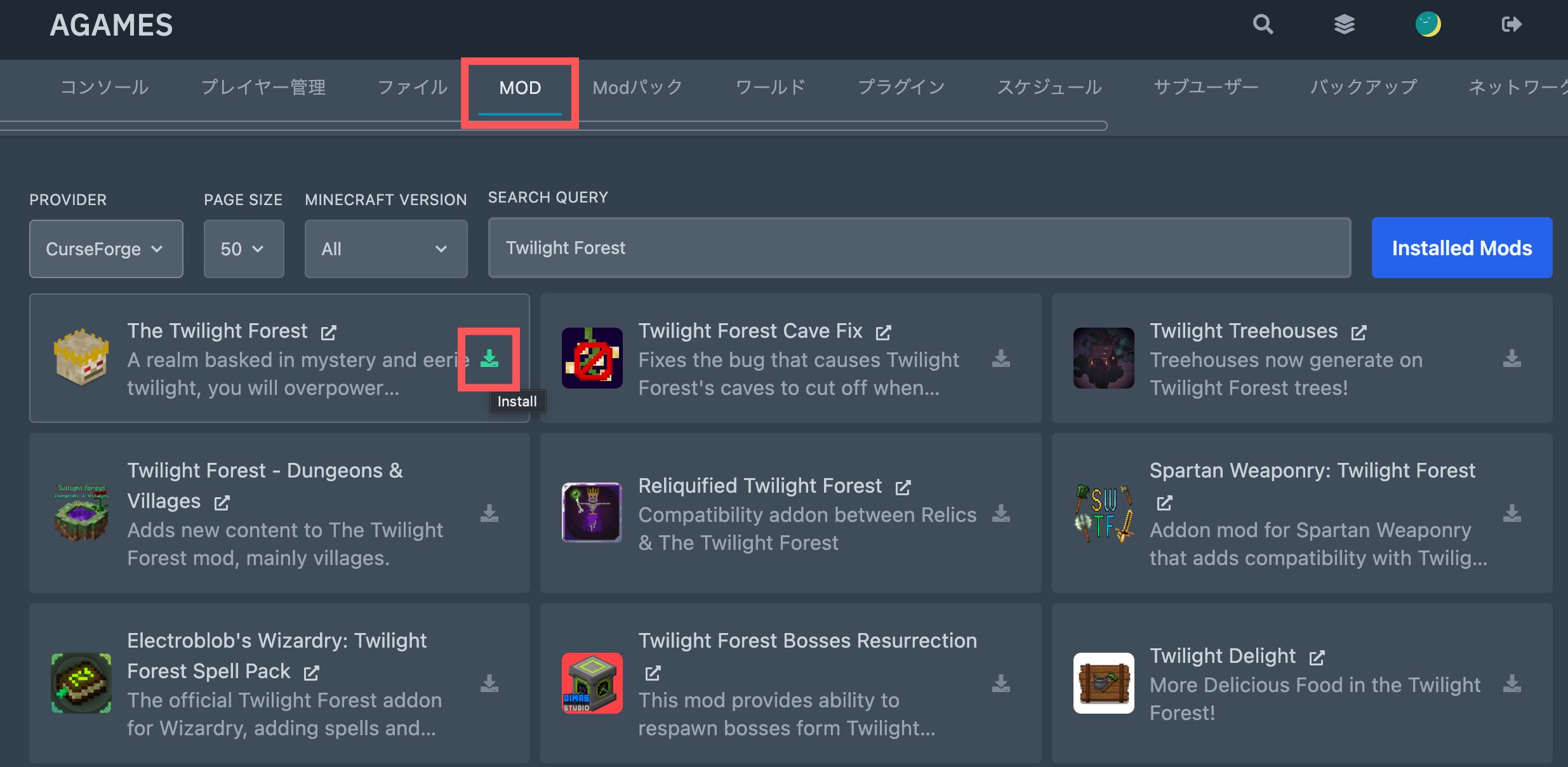 「Mod」のタブからインストールしたいModを検索して「」をクリックします。