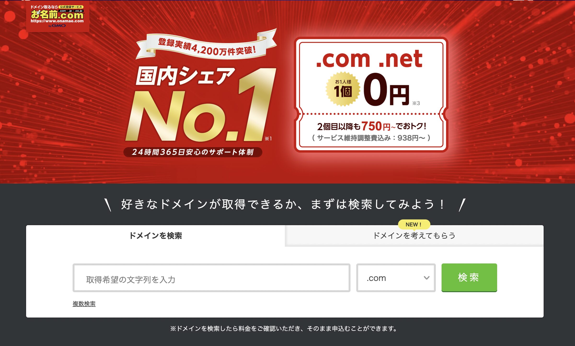 無料ドメインを提供しているサイトは色々あるのですが、今回は初めの1年間0円でドメインが利用できる「お名前.com」というサイトを使って解説していきます。