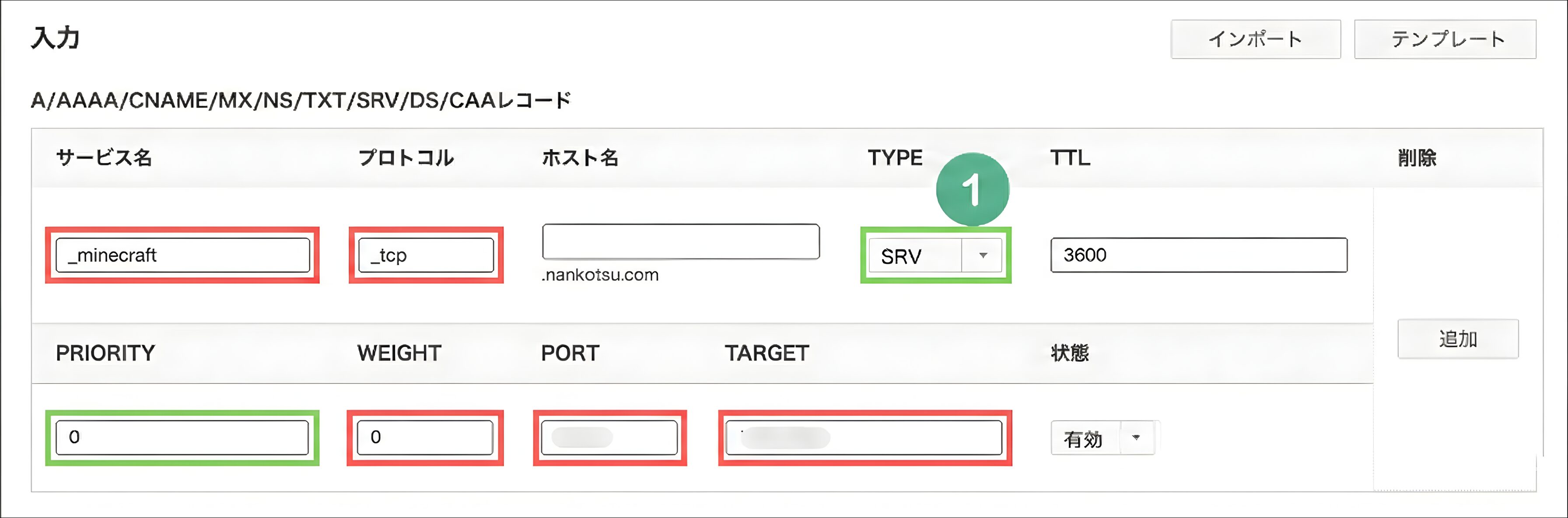 サービス名「_minecraft」、プロトコル「_tcp」、PRIORITY「0」、WEIGHT「0」という感じでそれぞれ入力してください。