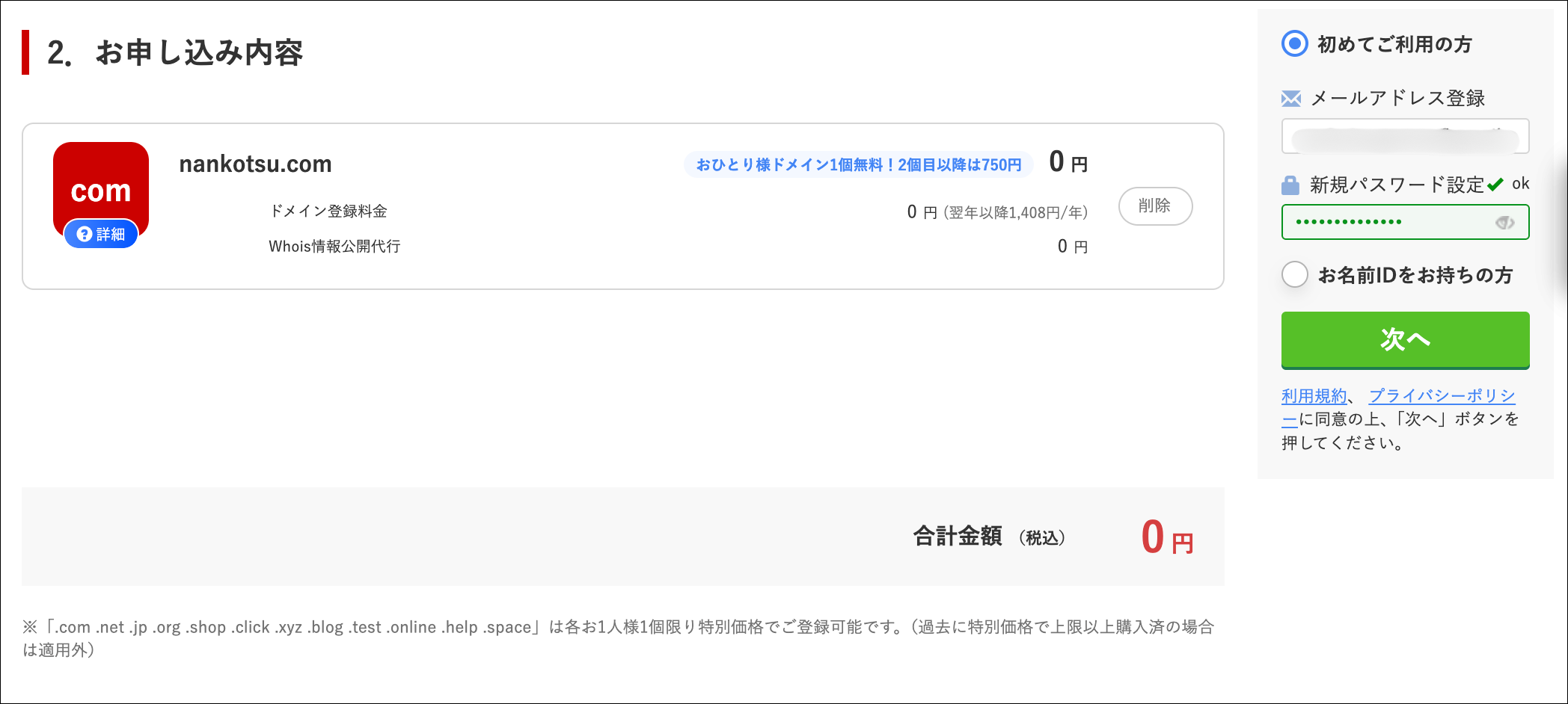お申し込み内容に余計なものが入っていないか(クーポンは例外)を確認し、メールアドレス/パスワードを入力したら「次へ」をクリックします。