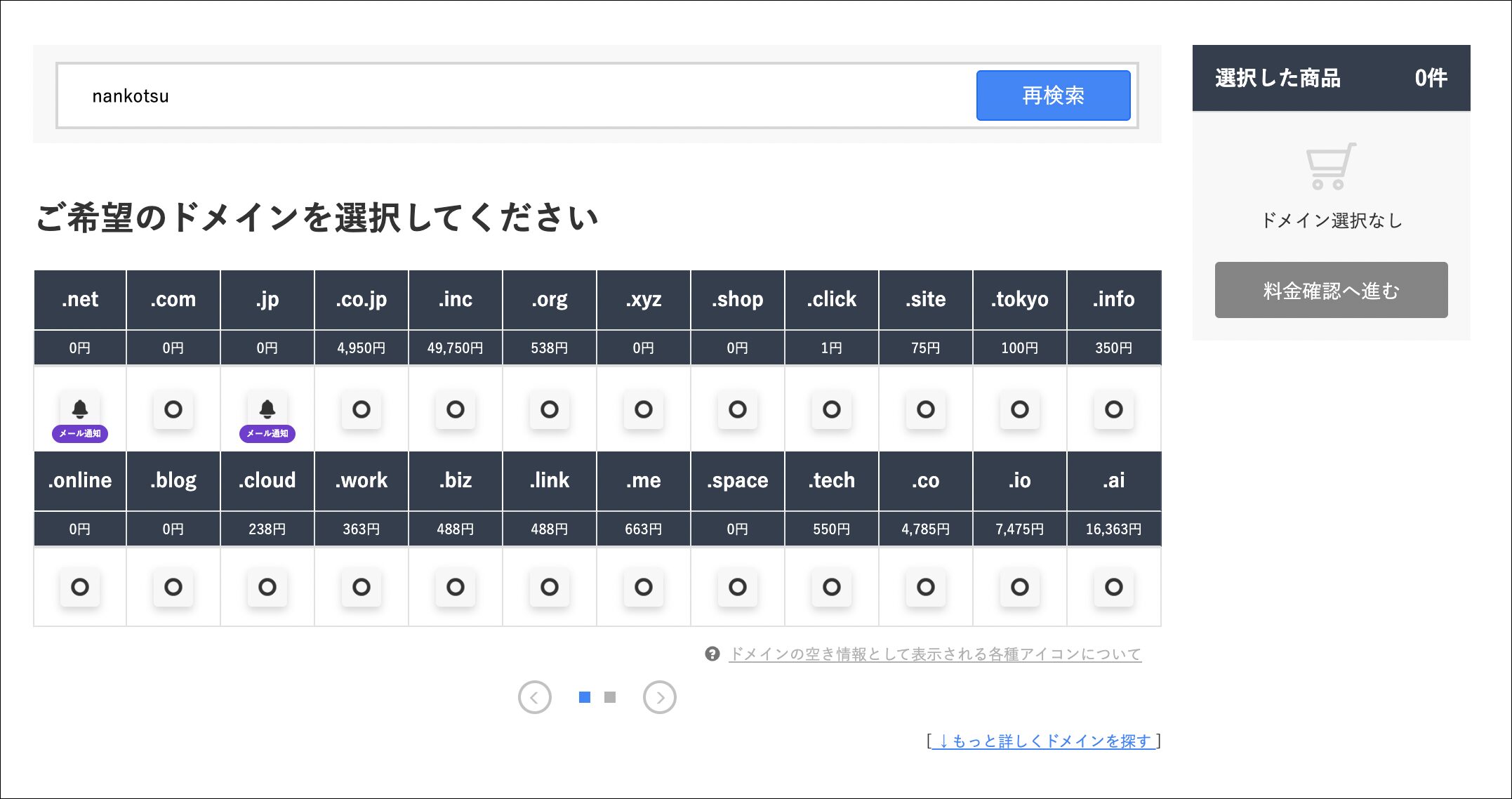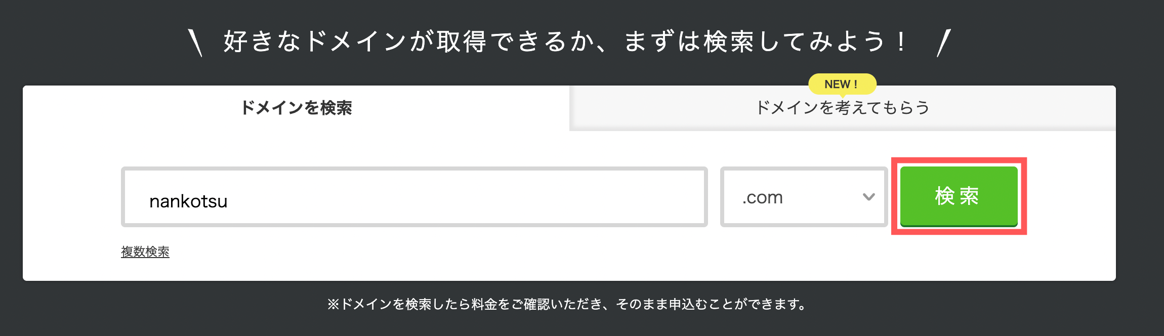 ドメインを検索の欄に取得したいドメイン名を入力して「検索」をクリック
