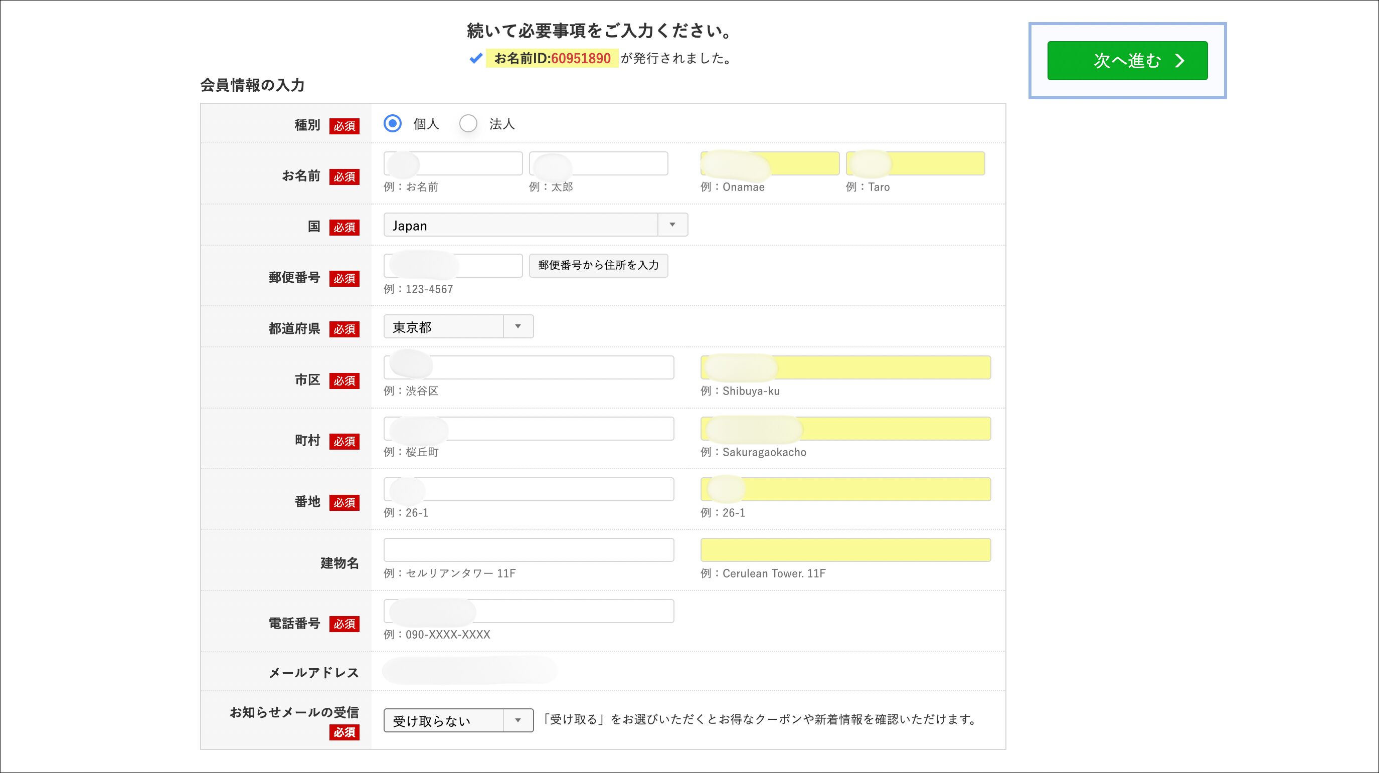 会員情報を入力して「次へ進む」をクリック