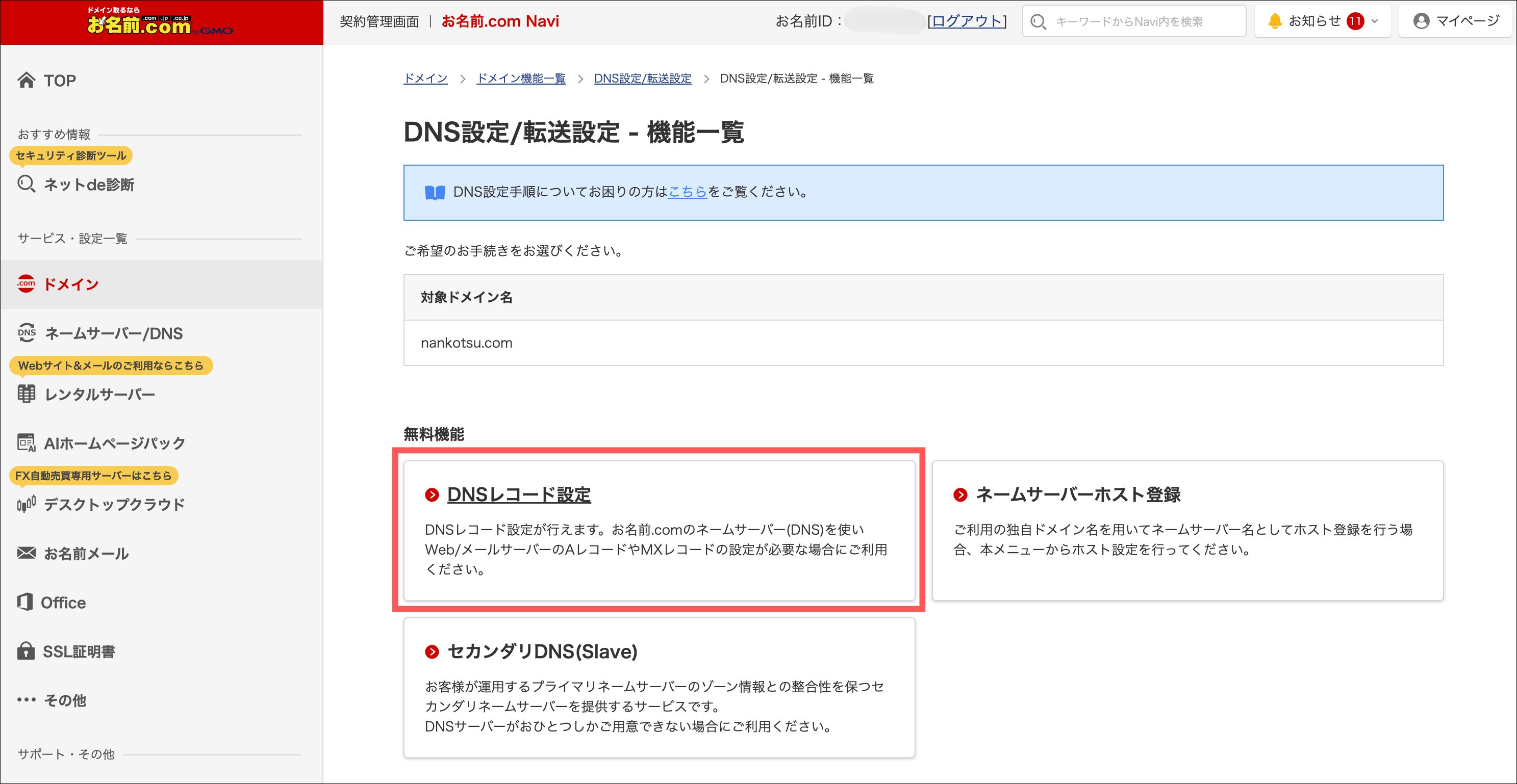 「ネームサーバー/DNS」から「ドメインDNS設定」をクリック
