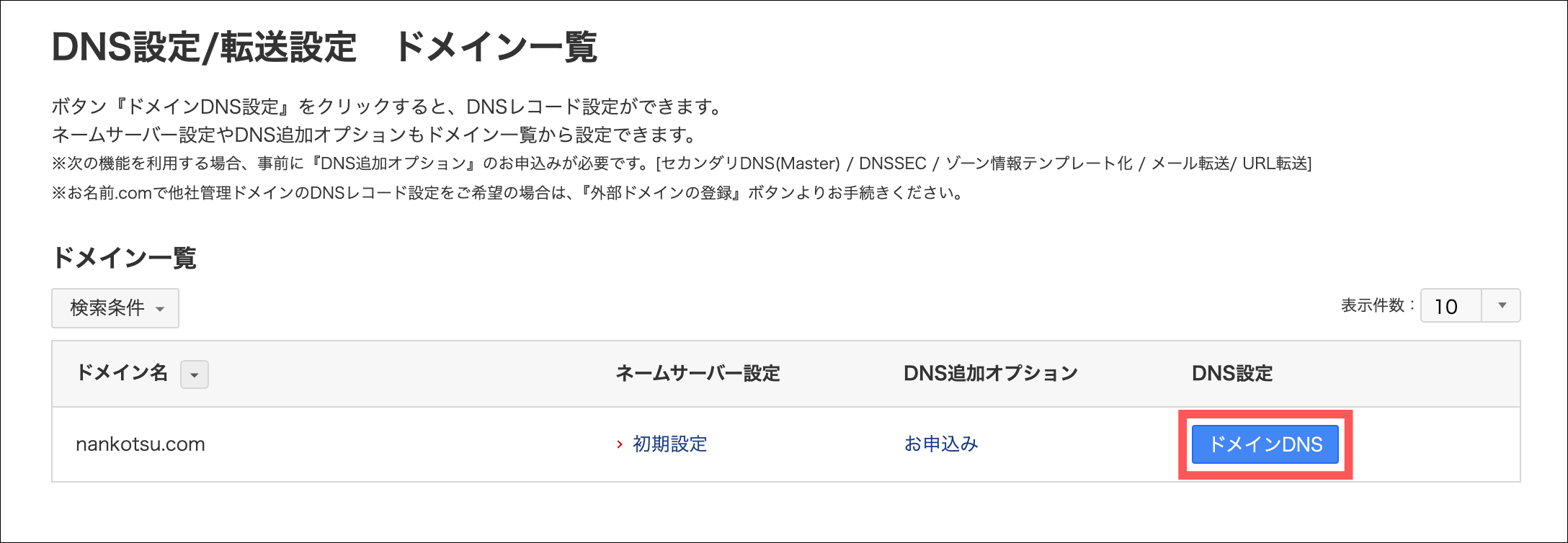 取得したドメインの「ドメインDNS」をクリック