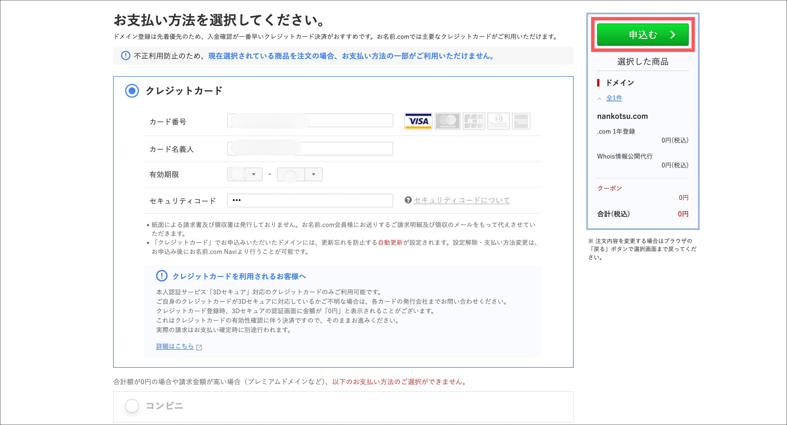 お支払い方法を入力したら「申し込む」をクリック