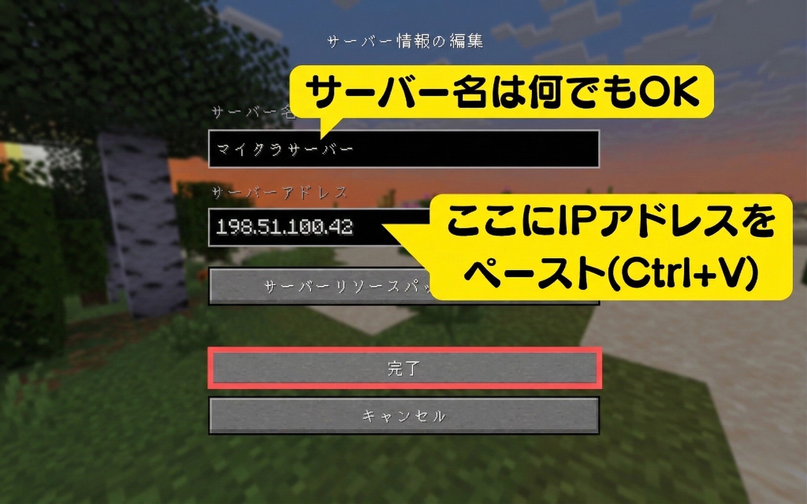 「マルチプレイ」▶︎「サーバーを追加」と進み、「サーバー名・サーバーアドレス」を入力したら「完了」をクリックします。追加されたサーバーを選んで「▶︎」をクリックすれば接続完了です!