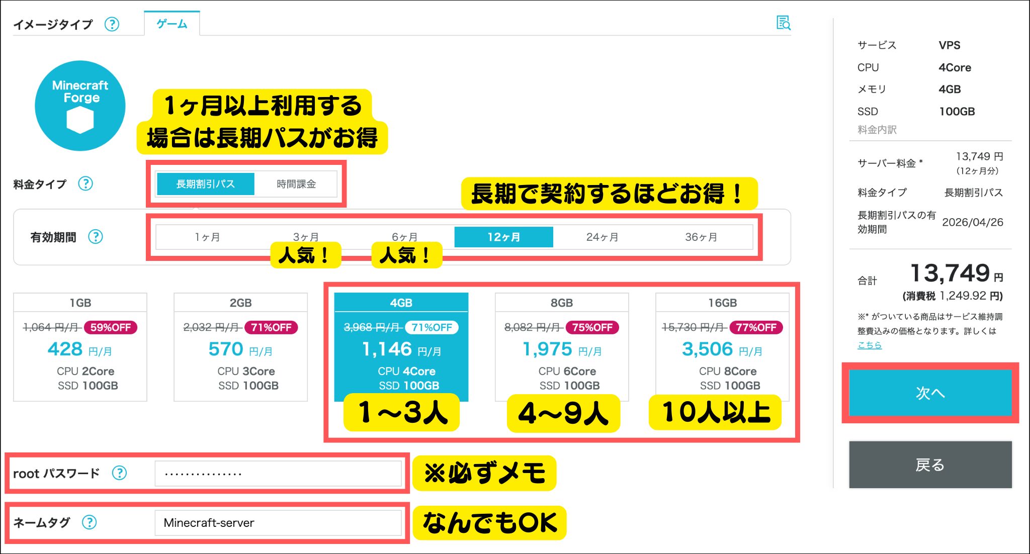 「料金タイプ」「有効期間」「rootパスワード」「ネームタグ」を入力します。