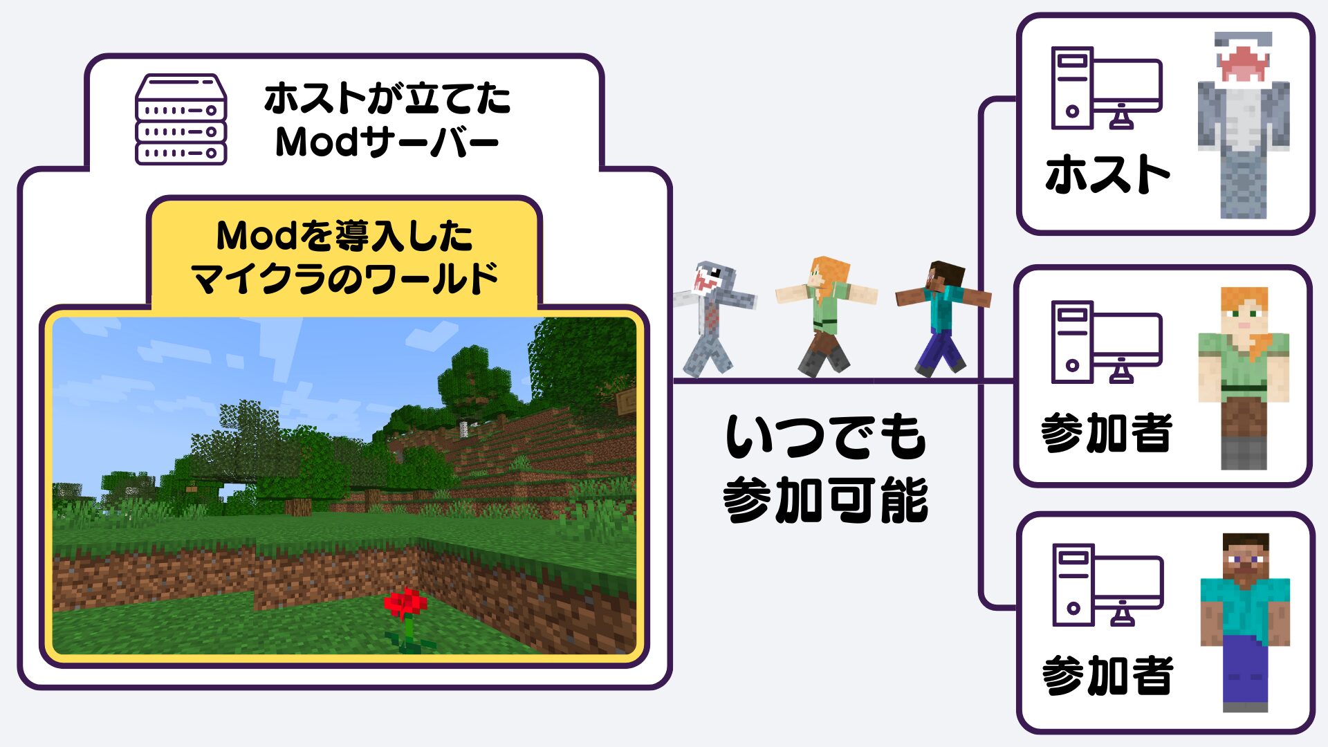 Modサーバーを立てると、ホストが居なくても24時間いつでも好きな時に、「Mod」を導入したワールドでマルチプレイを楽しむことが出来ます。