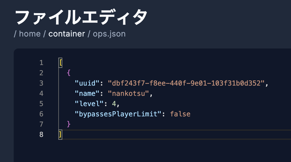 ※「ops.json」ファイルはOP権限の付与を行ったタイミングで作成されます。
