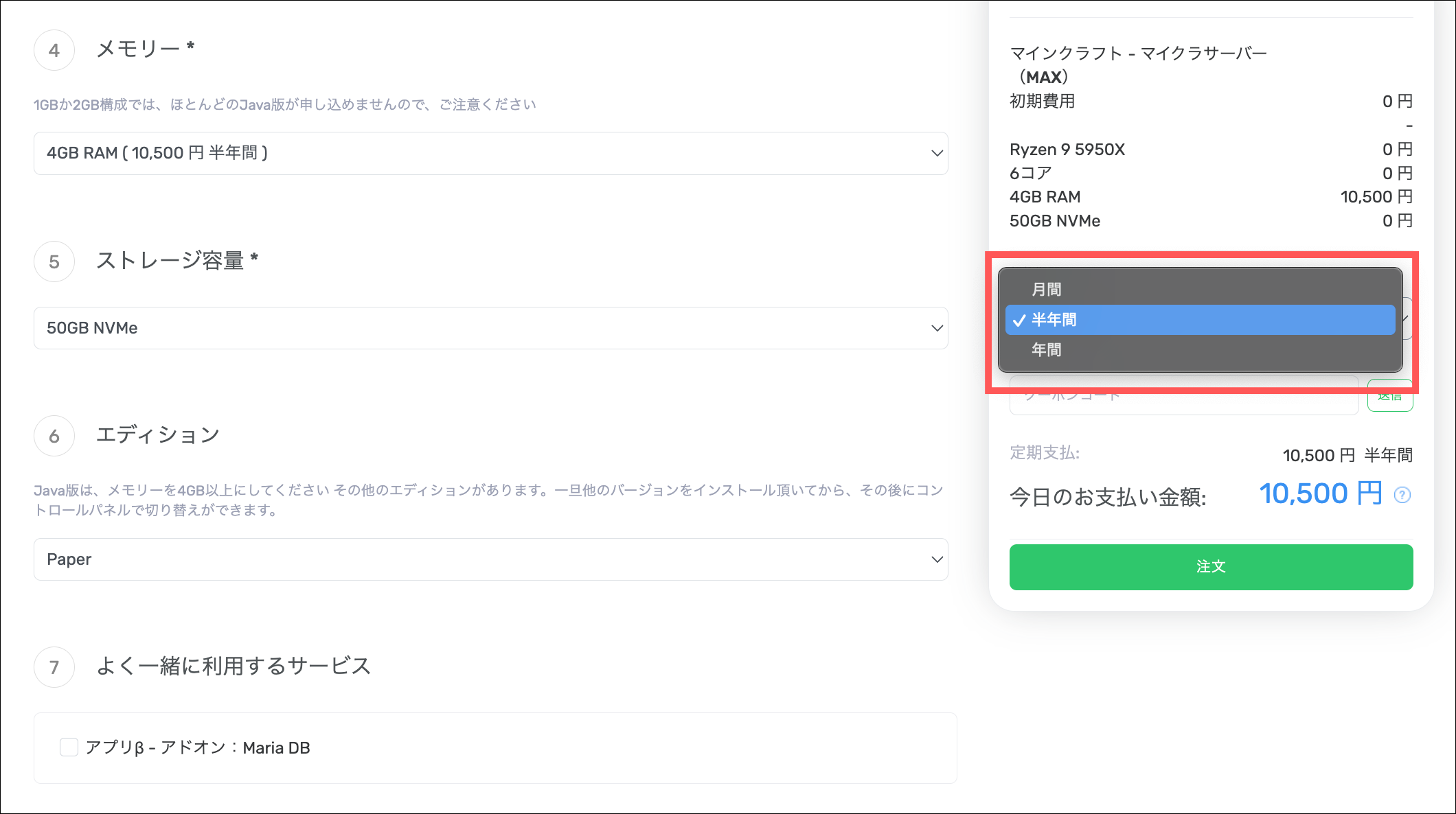 契約期間は、「月間」「半年間」「年間」から選択でき、長期で契約するほど安くなります。