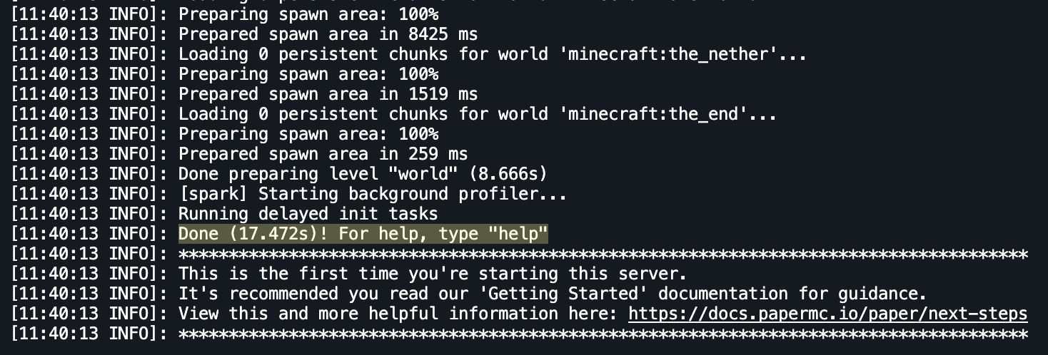 行の最後の方に「Done ! For help, type “help”」と表示されれば、起動成功です。