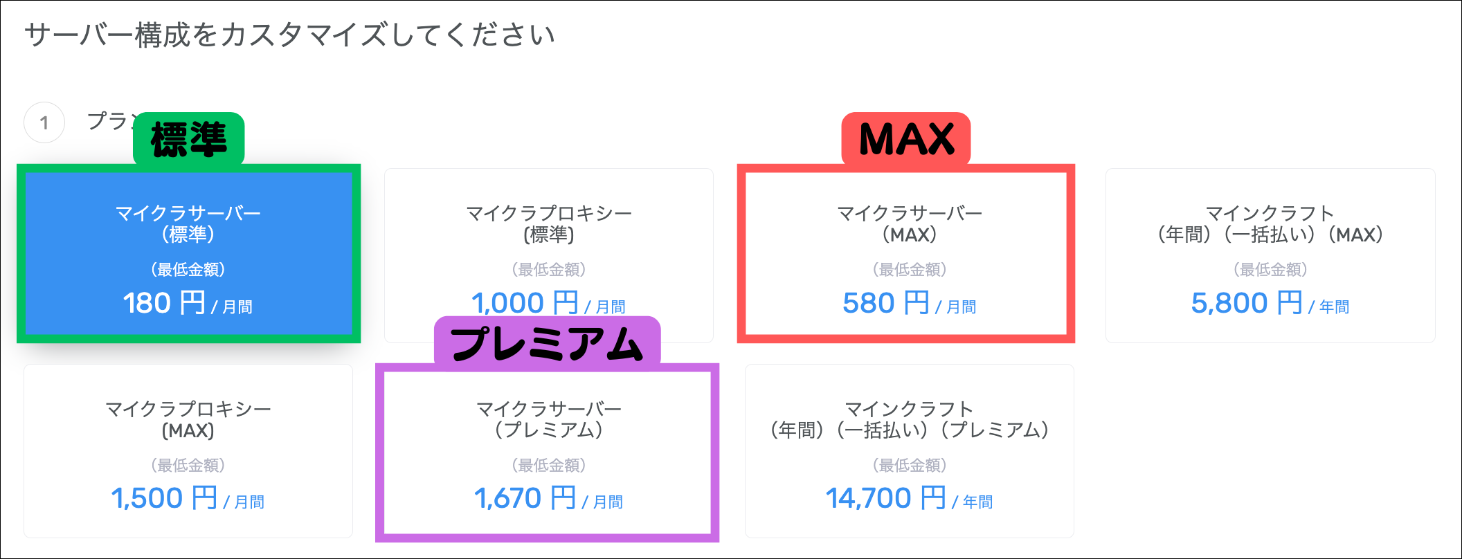 次に、使いたいマイクラサーバーのプランを(標準・MAX・プレミアム)から選びましょう。