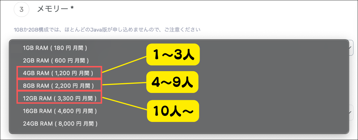 | 4GB(1~3人) | 8GB(4~9人) | 12GB(10人~) | |