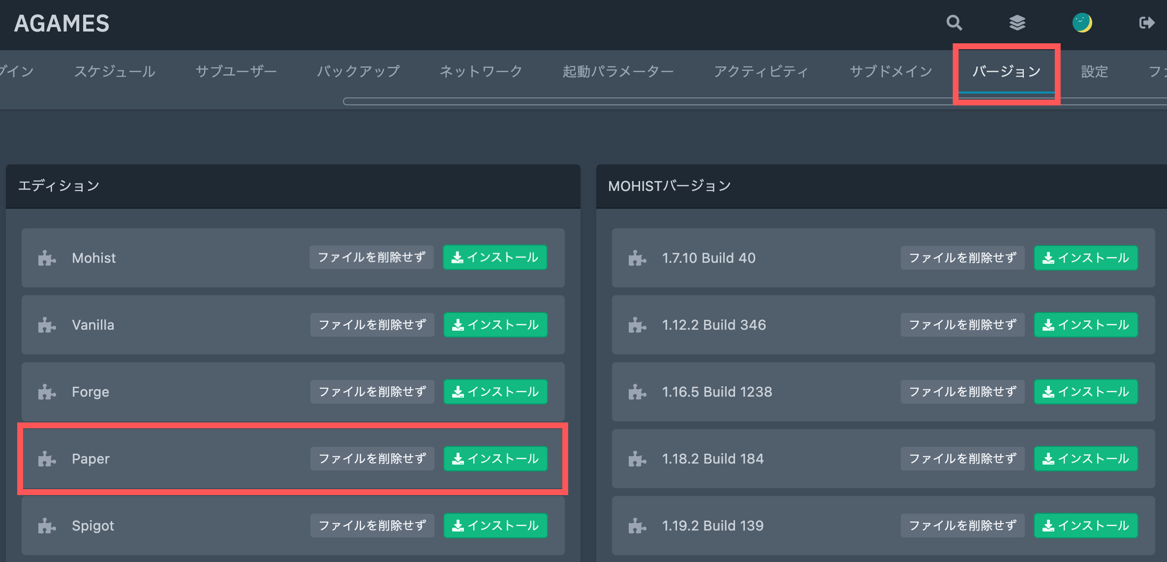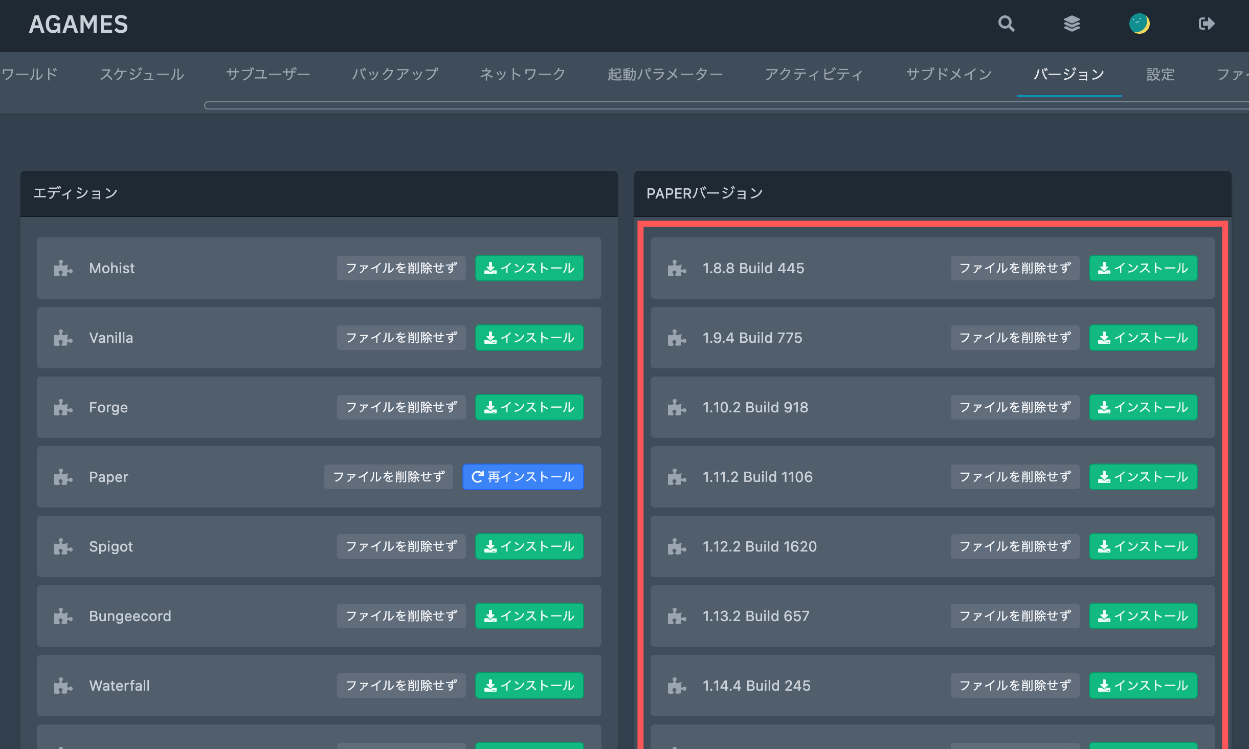 「バージョン」のタブから「Paper」の「インストール」をクリックします。