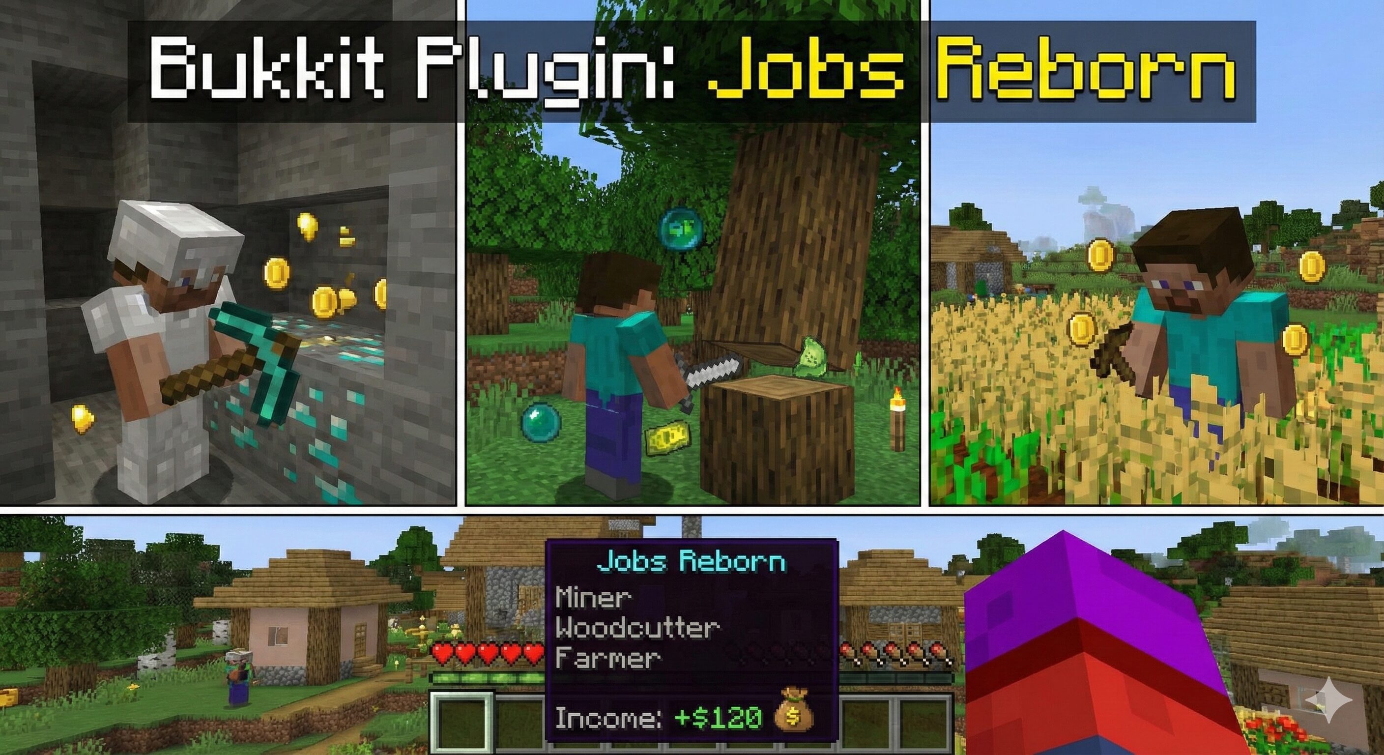 プレイヤーに「職業」を与え、日々の作業(採掘や伐採など)にお金という価値を持たせるプラグインです。