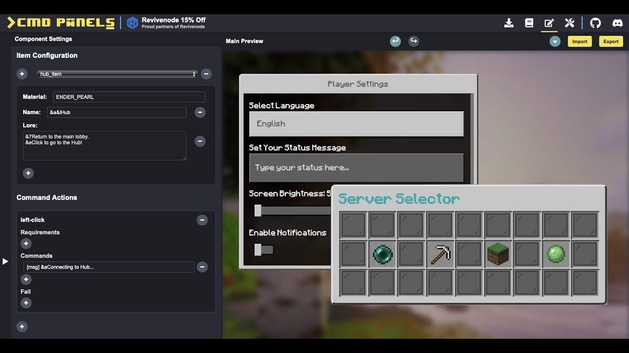 複雑なコマンドをアイコン一つに割り当てることができ、プレイヤーはチェストのような画面を開いてクリックするだけで、ワープやアイテム購入などのアクションを実行できます。