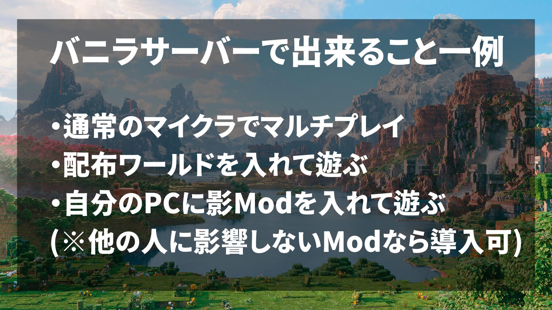 バニラサーバーは、追加要素(Mod/プラグイン)を入れていないサーバーのことで、普通のマイクラでマルチプレイしたい方におすすめです。