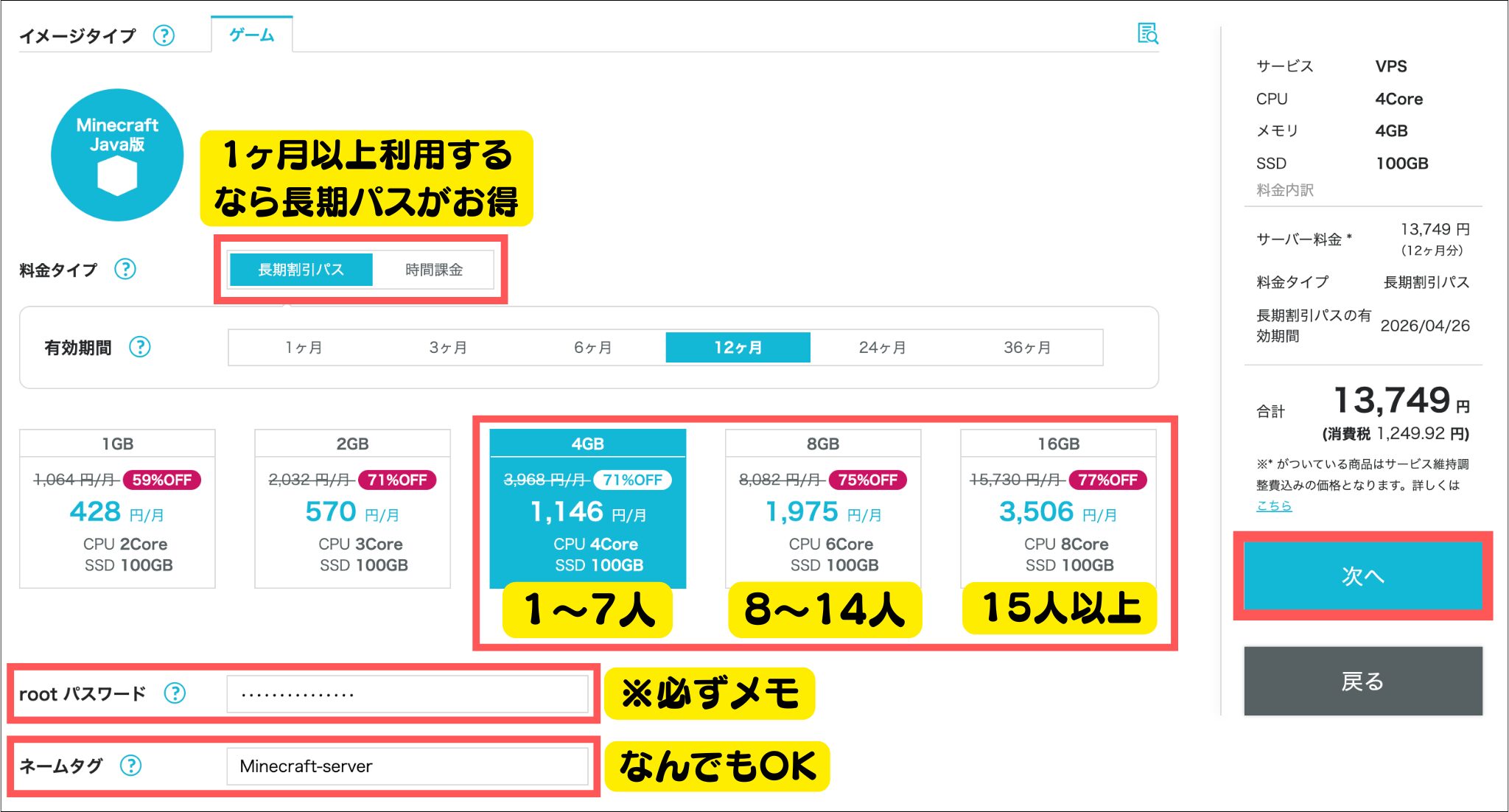 「料金タイプ」「有効期間」「rootパスワード」「ネームタグ」を入力します。