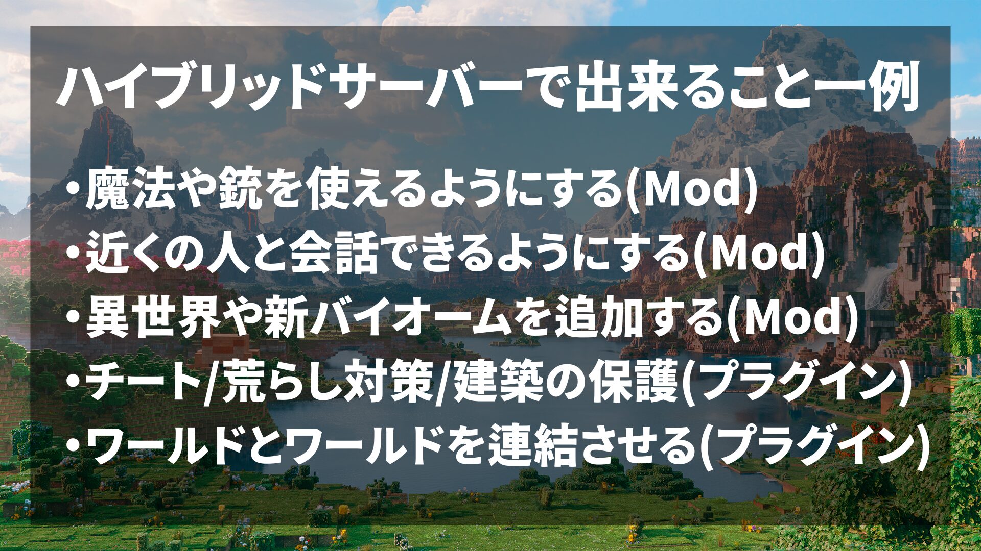 サーバー構築は少々手間がかかりますが、Modも入れたいけど、プラグインで「チート対策」や「建築の保護」などをしたいという時におすすめです。