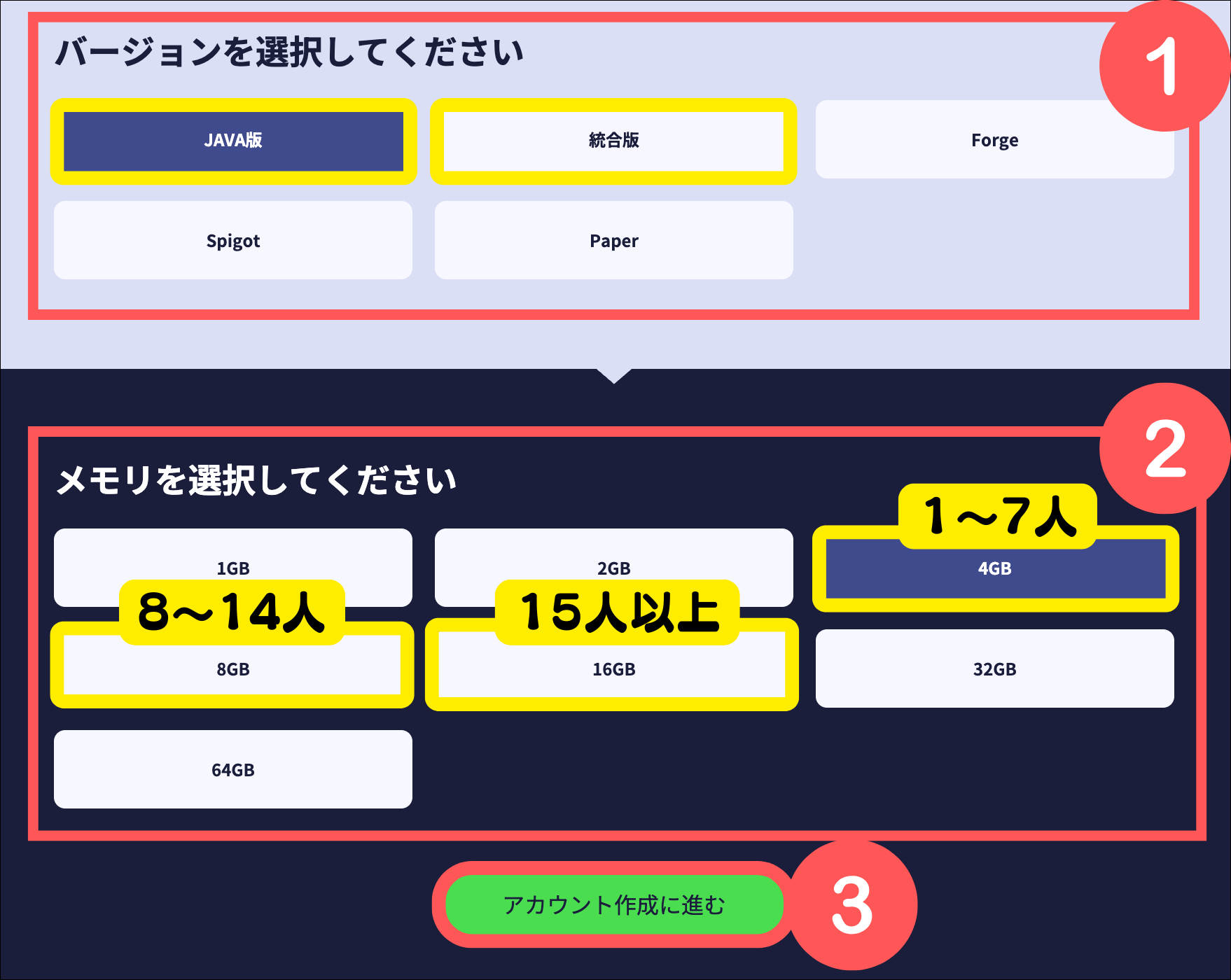 バージョンはJAVA版か統合版をメモリはプレイする人数に合わせて選択してください。それぞれ選択したら「アカウント作成に進む」をクリックします。