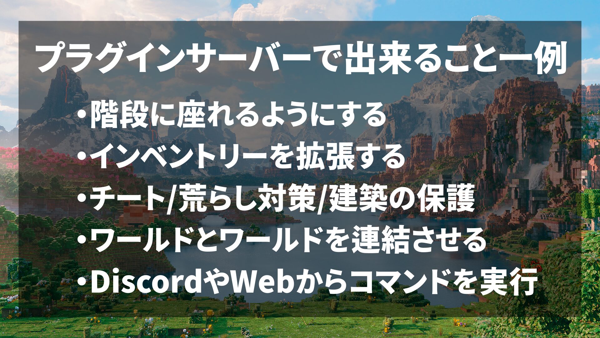 プラグインサーバーは、プラグインを導入してワールドの管理や便利な機能の追加ができるマイクラサーバーです。