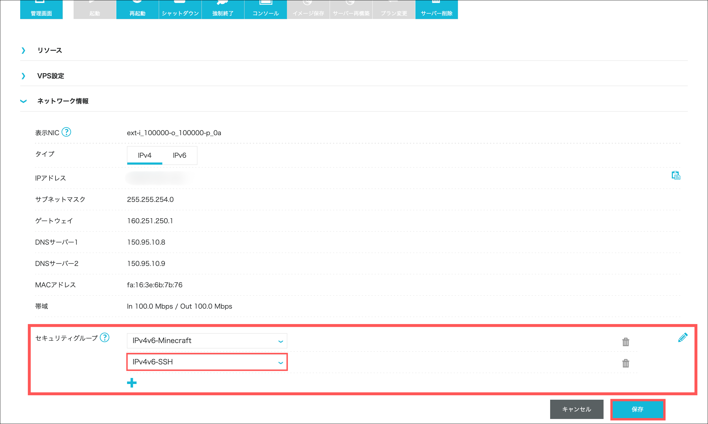 セキュリティーグループで「IPv4v6-SSH」を選択して保存