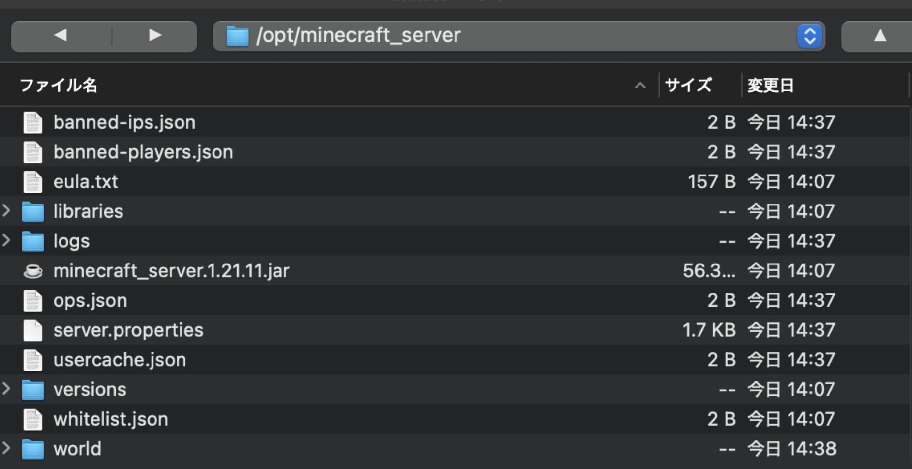 「opt」▶︎「minecraft_server」の順に移動してこのようなフォルダーにアクセスする