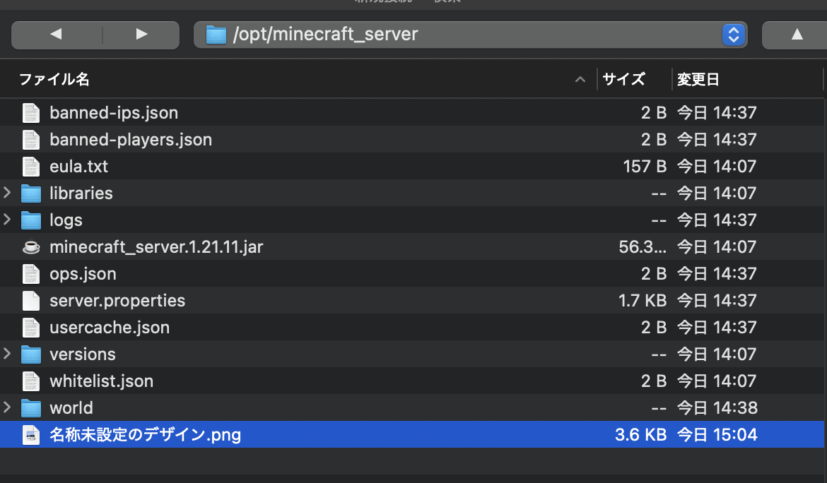 サーバーフォルダー(server.jar や eula.txt がある階層)に作成したアイコン画像を移動させます。