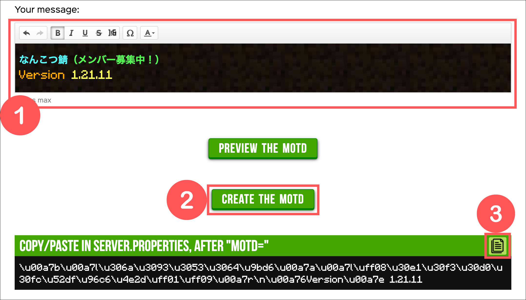 アクセスしたら説明欄に表示させたい文章をそのまま入力したら「CREATE THE MOTD」をクリックしてコードをコピーしてください。