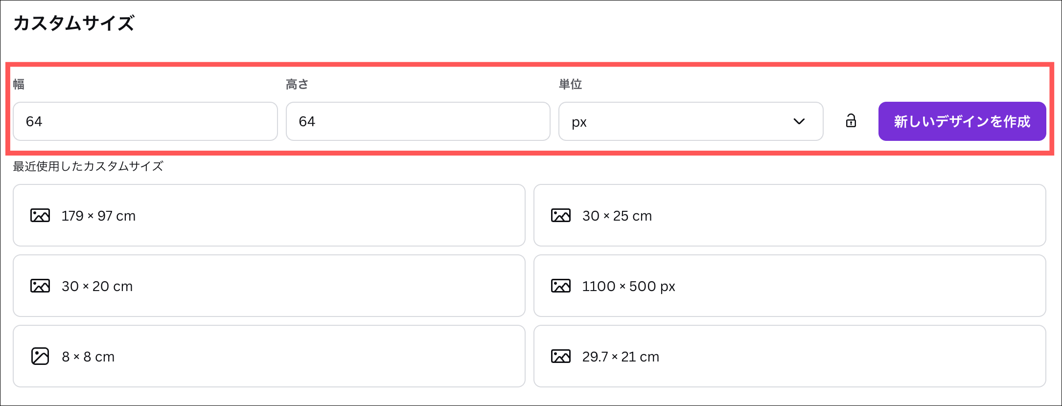 幅・高さを64に単位をpxに設定して「新しいデザインを作成」をクリック