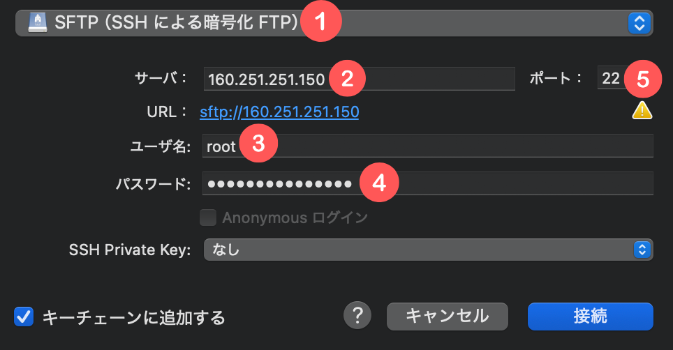 ①「SFTP(SSHによる暗号化 FTP)」を選択