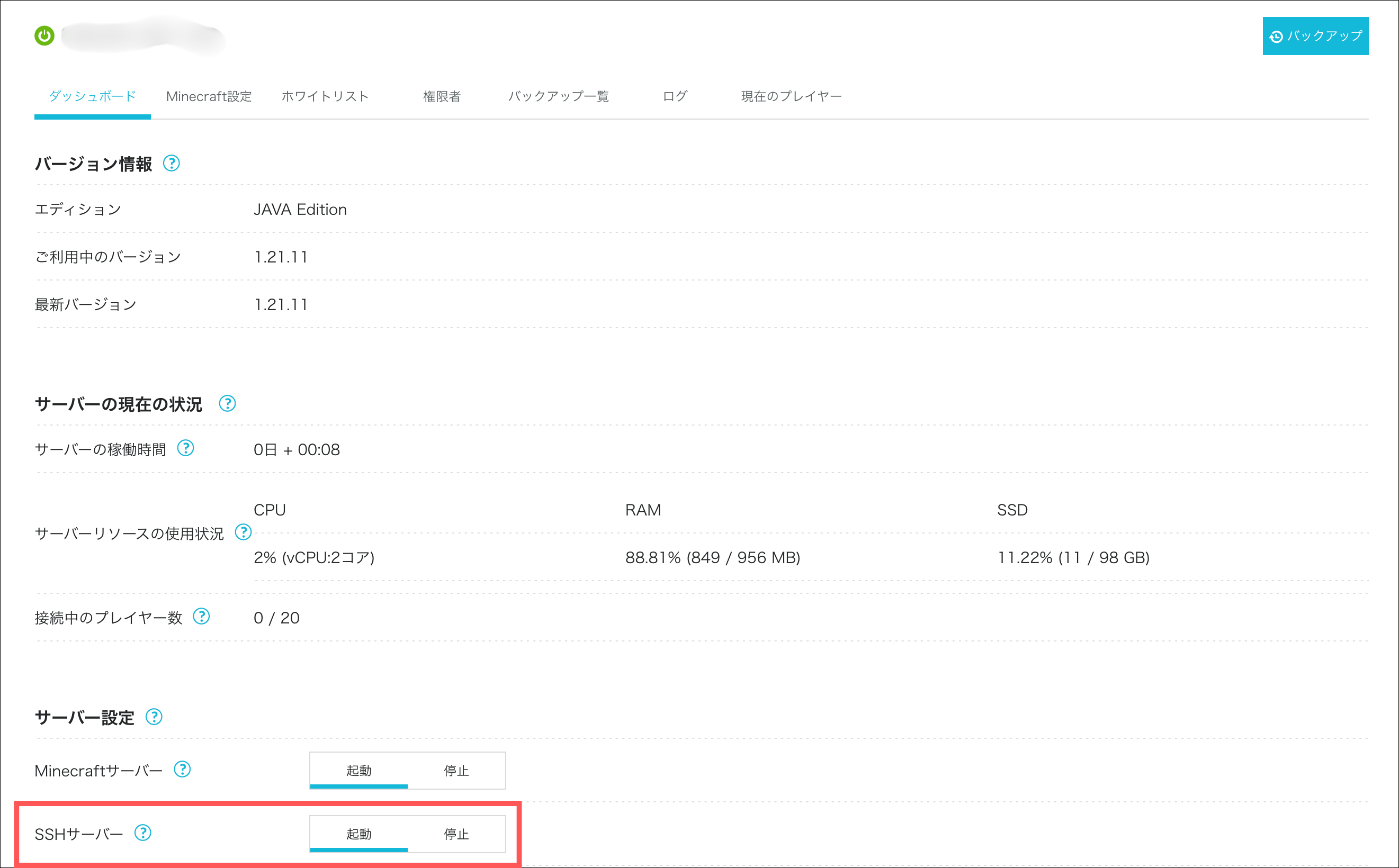 管理画面のダッシュボードからSSHサーバーを起動させる