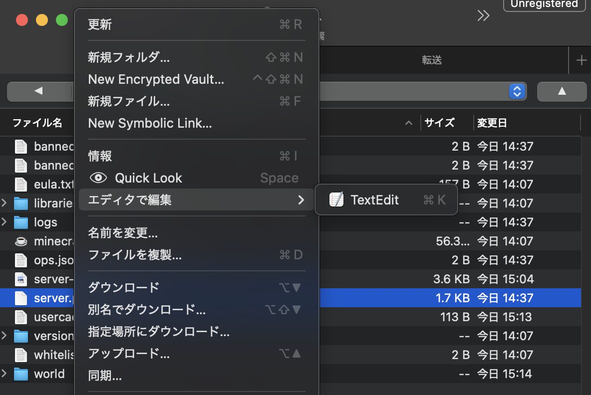 「surver.properties」を右クリックしエディターで編集をクリック