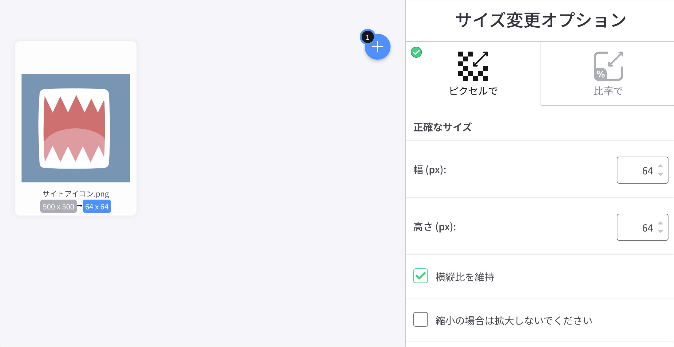 次にこちらのサイトで正方形になった画像のサイズを「64px×64px」に変換していきます。