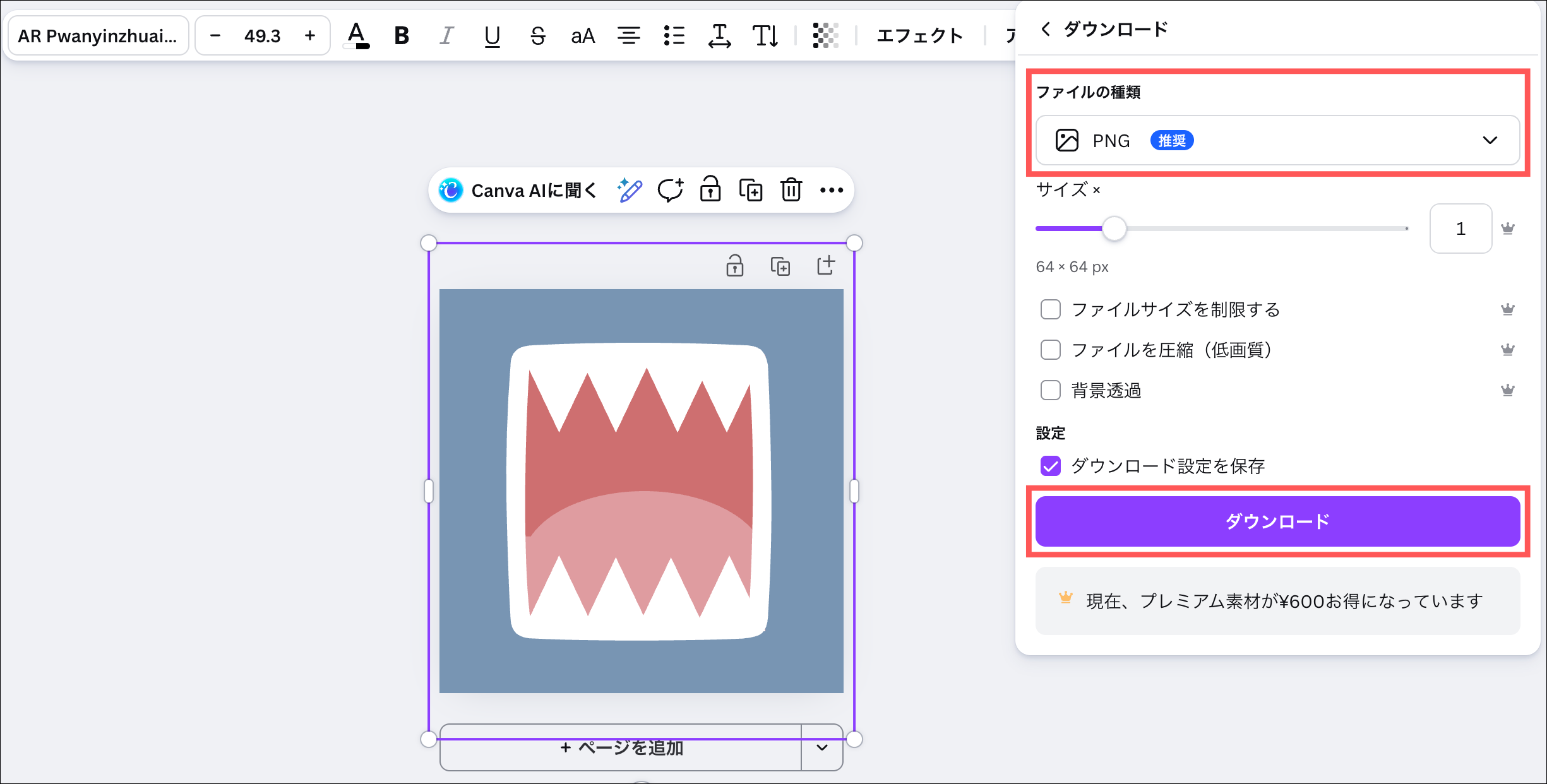 ファイルの種類がPNGになっているか確認して「ダウンロード」をクリック