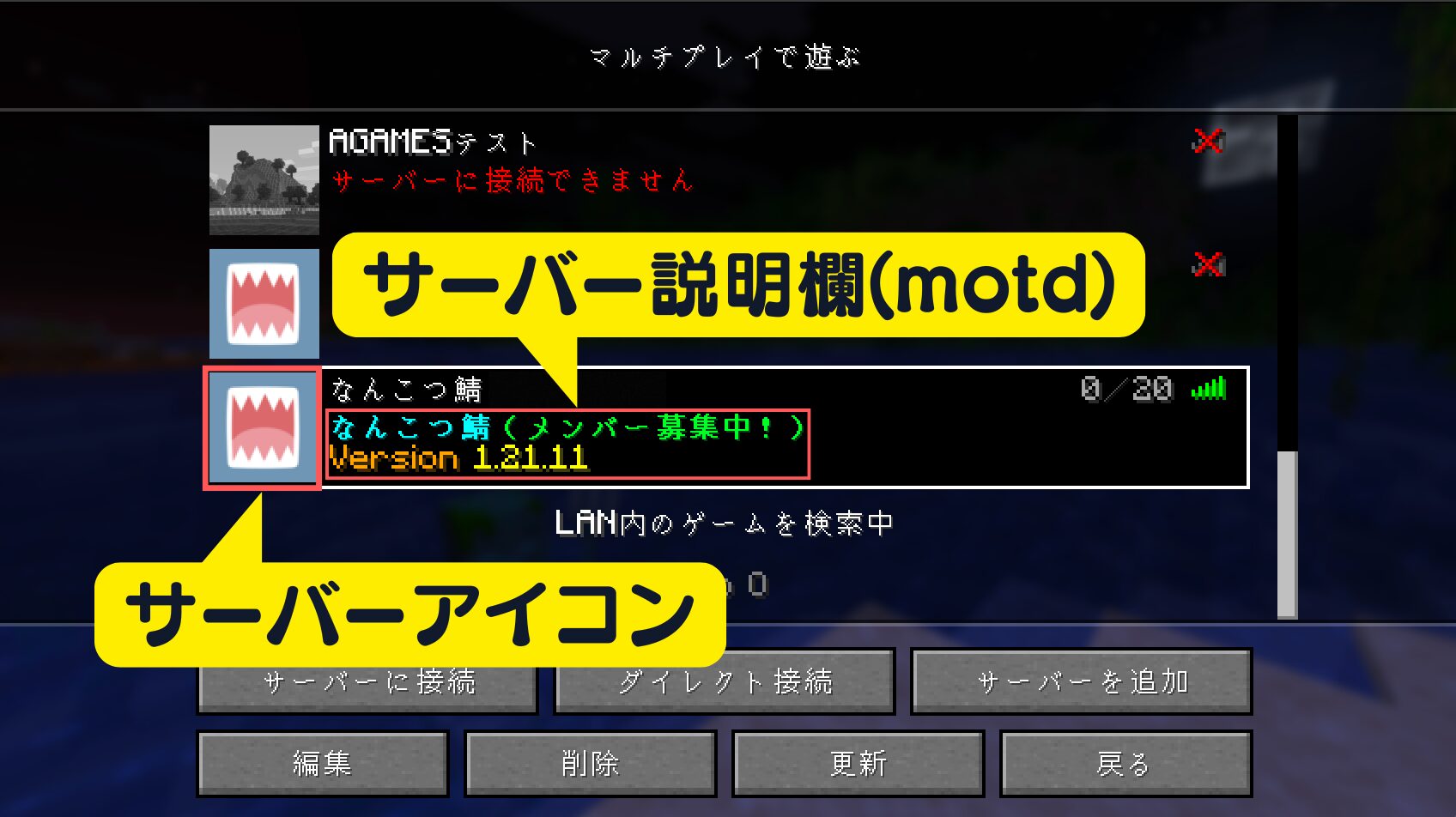 マイクラサーバーのアイコン/説明欄とは、上記画像のように、サーバーに参加する際に一覧画面に表示されるアイコンと、その左に表示される説明文のことです。