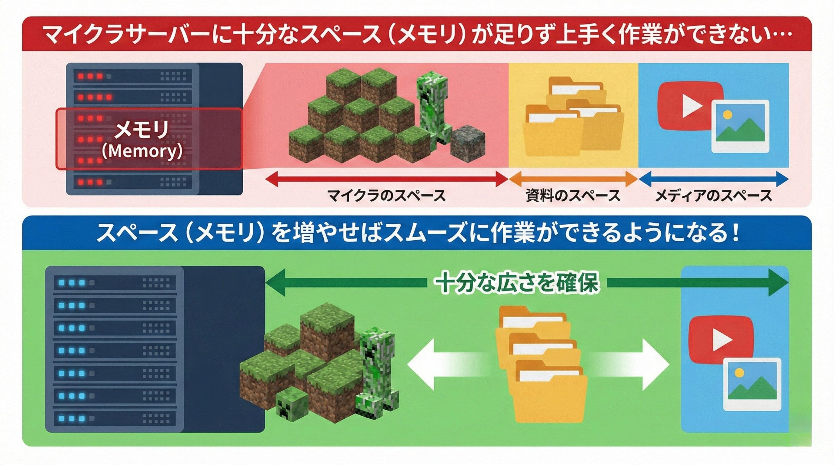 マイクラのサーバーは地形やMobなどの膨大なデータをすべてメモリという「作業台」で処理しており、メモリがいっぱいになると処理が追いつかず「ラグ」が発生します。